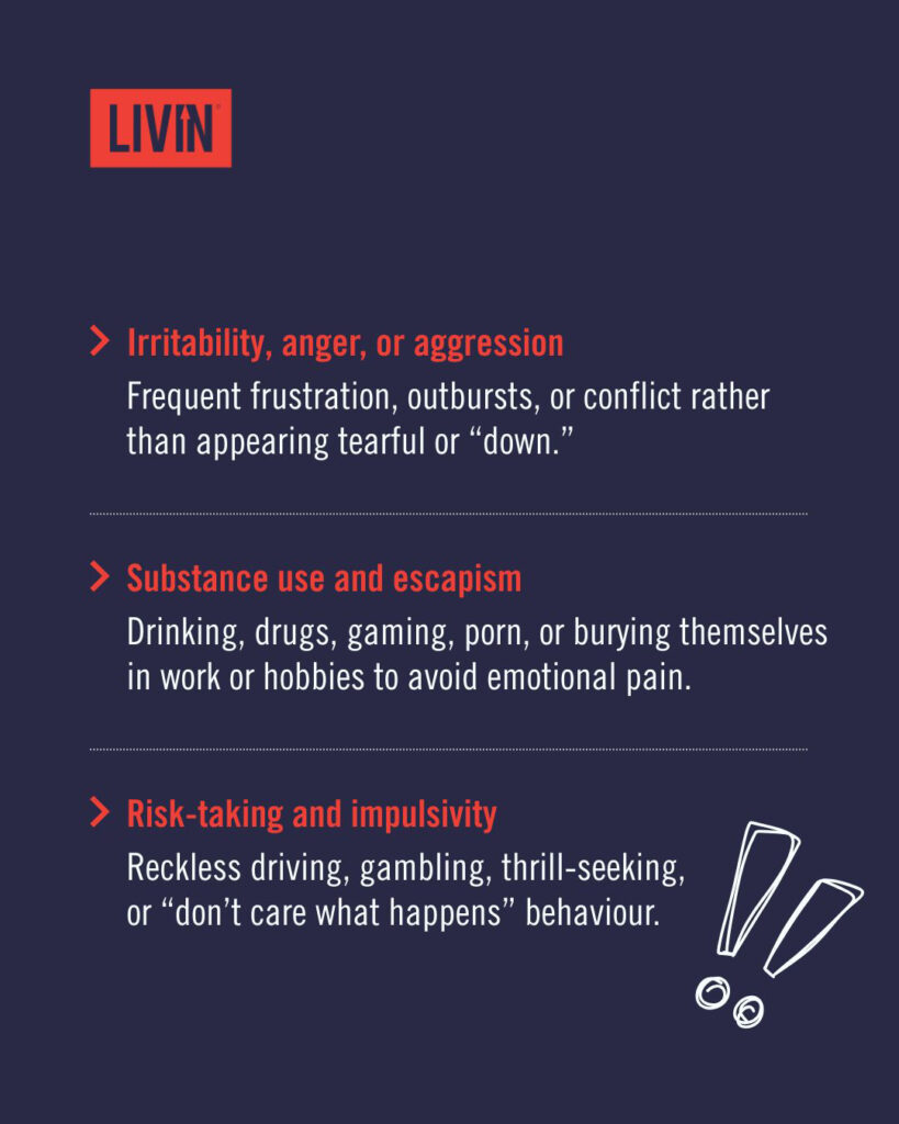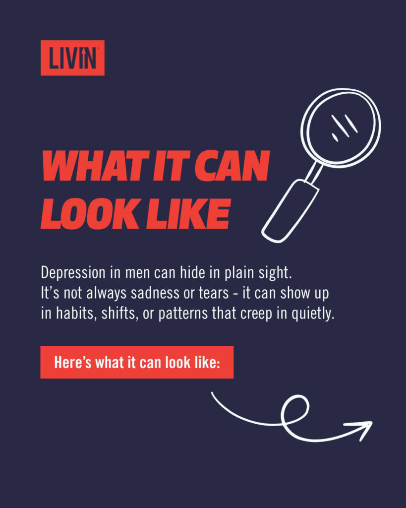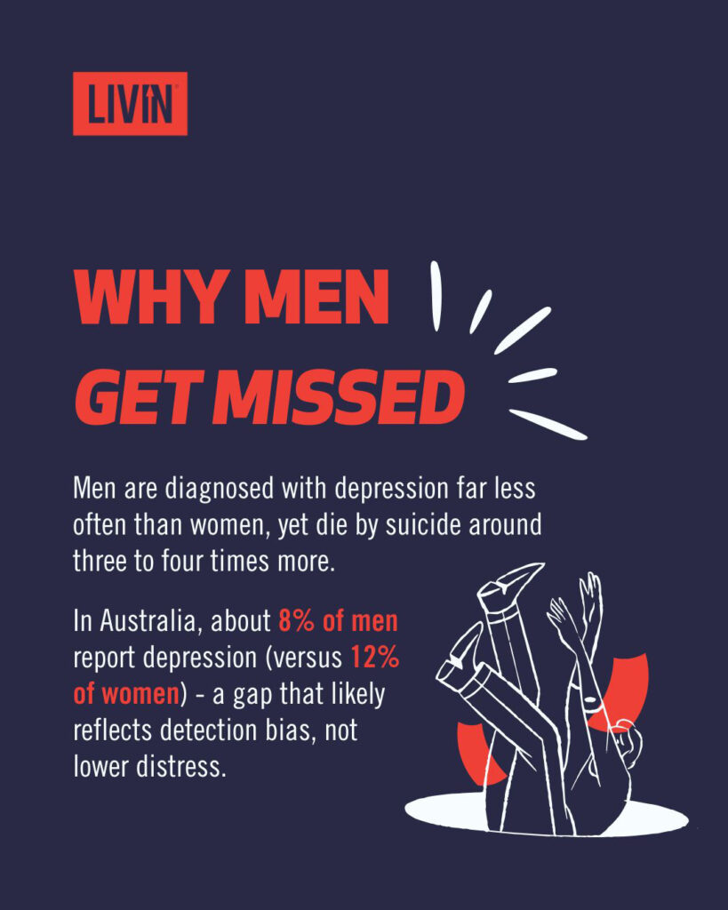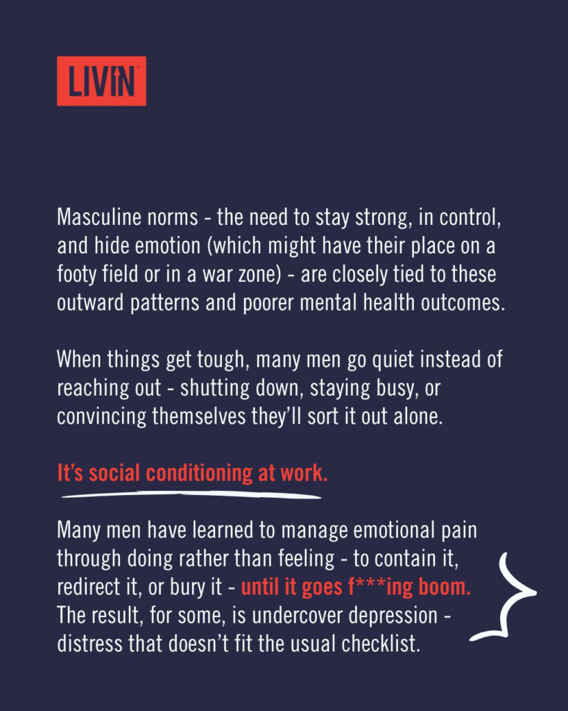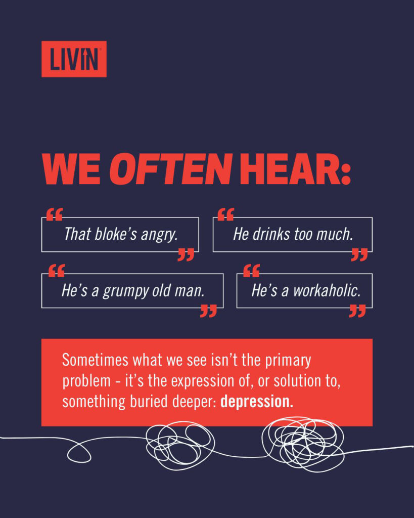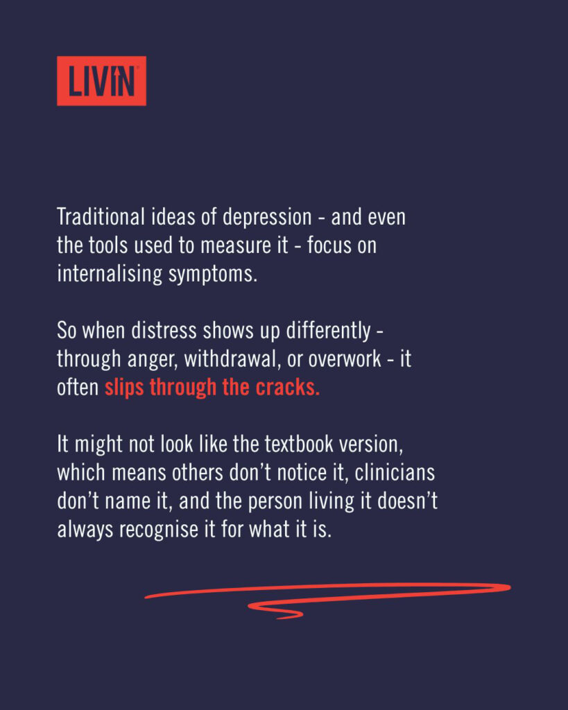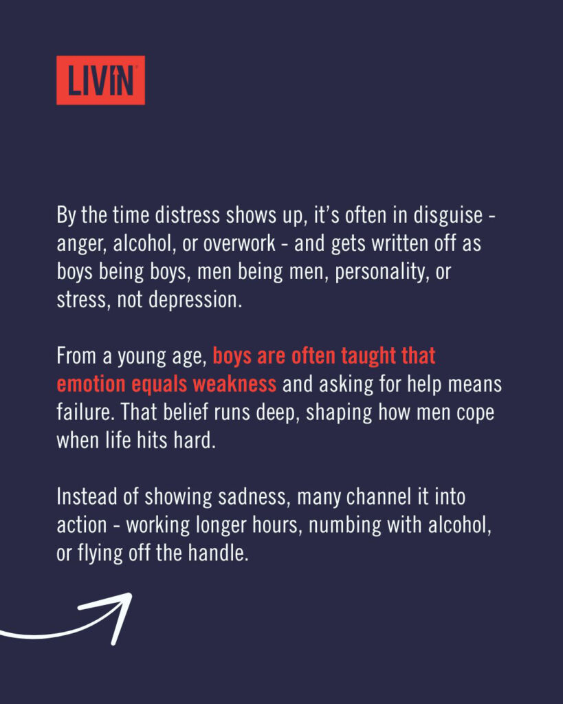 By the time distress shows up, it’s often in disguise – anger, alcohol, or overwork – and gets written off as boys being boys, men being men, personality, or stress, not depression.