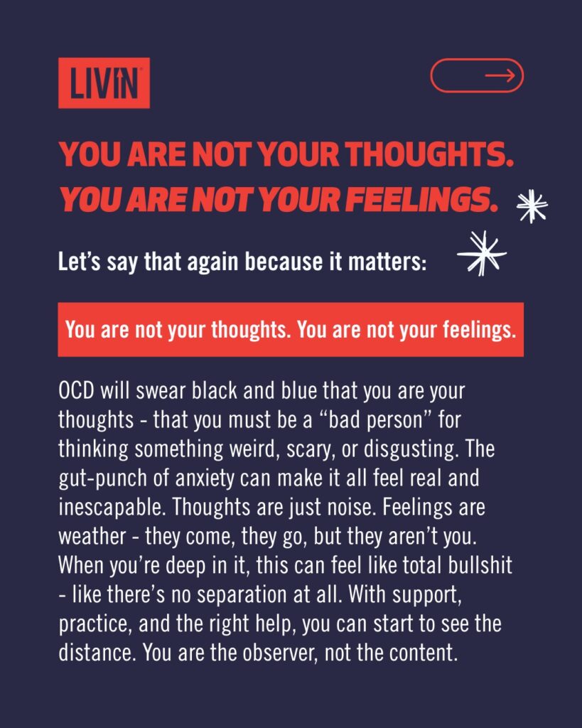 OCD will swear black and blue that you are your thoughts — that you must be a “bad person” for thinking something weird, scary, or disgusting. The gut-punch of anxiety can make it all feel real and inescapable. Thoughts are just noise. Feelings are weather — they come, they go, but they aren’t you. When you’re deep in it, this can feel like total bullshit — like there’s no separation at all. With support, practice, and the right help, you can start to see the distance. You are the observer, not the content.