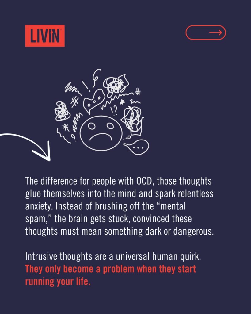 • Intrusive thoughts are absolutely normal (every brain does it). OCD is when they stick and dominate your life.